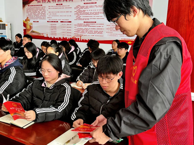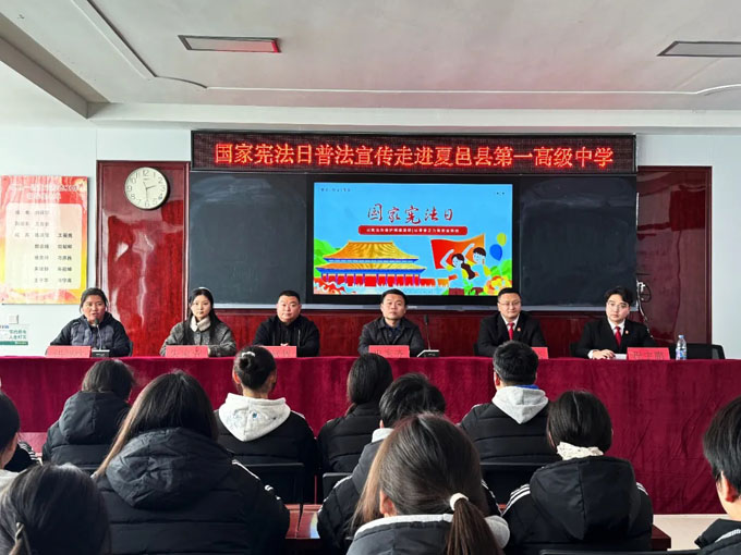 为深入贯彻落实习近平法治思想,迎接“12·4”国家宪法日,切实提升青少年法治素养和自我保护能力,共青团夏邑县委联合县人民法院团委走进夏邑县第一高级中学,举办国家宪法日普法宣传活动。共青团夏邑县委副书记申家齐、组织部部长朱家萱,县人民法院综合办公室副主任彭尚飞、刑事审判庭法官助理程宇鹏,夏邑一高党委副书记司献辉出席活动,活动由夏邑一高团委书记洪智欣主持。