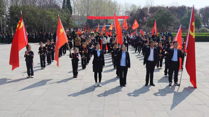 梨花风起正清明,缅怀英烈寄哀思。为深入贯彻爱国主义教育,充分发挥党建引领作用,构建“党带团、团带队”的红色传承链条,商丘市第二实验小学将思政课堂搬到商丘市革命烈士陵园,组织党员、团员代表及五六年级优秀少先队员代表,开展“缅怀先烈志 传承红色魂”主题祭扫活动,以一堂行走的、鲜活的思政课,引导师生铭记历史、继承遗志、砥砺前行。 商丘市第二实验小学市府校区