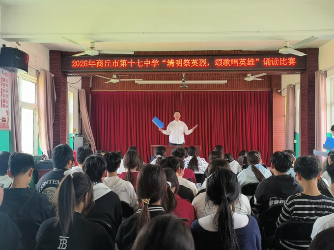 清明将至,商丘市第十七中学以“追寻·2026·清明祭英烈”主题活动为契机,将红色教育融入育人实践。清明节前夕,学校以校园活动为载体,以追忆英雄为纽带,以主题班会和诵读比赛为形式,打造沉浸式、递进式的红色育人课堂,让英烈精神浸润心灵,让大思政课落地生根、走实走心,让红色精神浸润校园,让英烈精神代代相传。 宋集镇贾半楼小学