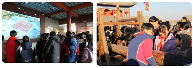 商丘古城南门——触摸千年文脉,聆听先贤故事 孩子们探索之旅的第一站,来到了商丘古城南门拱阳门。商祖王亥服牛乘马、开辟商路的开拓精神,忠烈张巡死守睢阳、保家卫国的民族气节,一个个先贤故事通过讲解员生动的讲述,深深印刻在孩子们的心中。他们驻足于城门之上,眺望古城内错落有致的古建筑与街巷间的人间烟火,感受“古城风、现代味、烟火气”的独特魅力,在古今交融的场景中,读懂“殷商之源”的深厚底蕴。