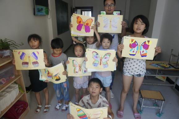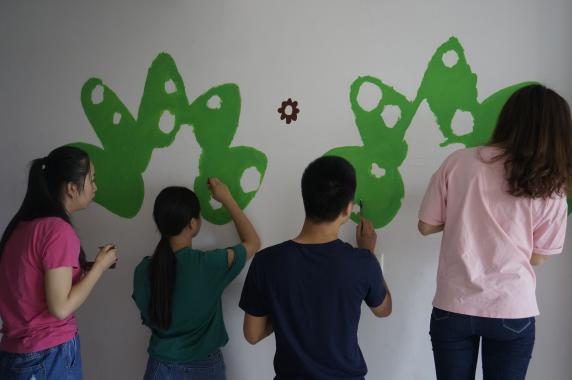 绘画组的志愿者主要负责为孩子们上课的教室的墙壁进行彩绘,志愿者通过事先和老师进行沟通,再确定每个教室的绘画主题。课间,当孩子们看到自己上课的教室在被志愿者们装饰,眼中闪现的惊奇与喜悦。虽然无法用语言清楚表达,依然用自己的“咿咿呀呀”或者用自己的小手为志愿者们做出很棒的手势来表达对志愿者们的赞美。无言的表达与赞美就是对志愿者辛勤劳动最大的肯定。