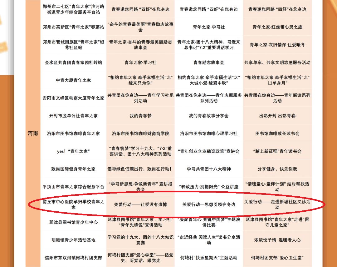 近日,2018年全国“青年之家”主题活动季优秀项目征集活动结果揭晓。活动通过团中央官微、“青年之家”云平台和各省级团委广泛发布动员,由基层自荐、省级团委推报、团中央基层建设部组织评审,经团中央书记处审批实施,最终共评选出351个优秀项目(共1069个子项目)。商丘市中心医院孕妇学校青年之家申报的“共青团在你身边—关爱行动”项目成功获选。