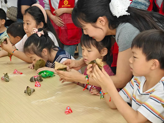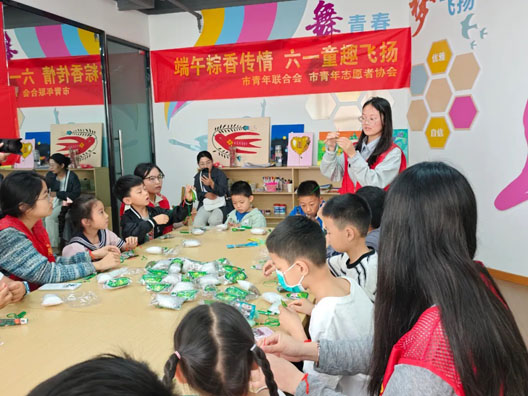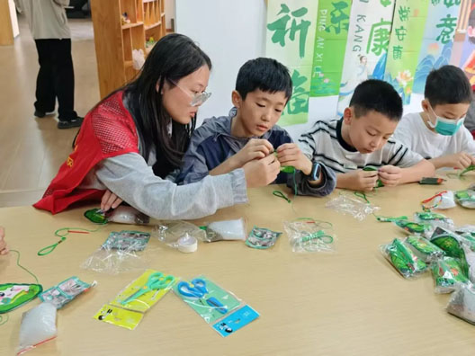 活动现场,青年志愿者为孩子们佩戴上五彩绳,与孩子们围坐在一起包粽子,捋粽叶,做成漏斗状,填糯米、压紧实、封口、扎捆。在志愿者的耐心指导下,孩子们手中一个个形态各异的粽子逐渐成形。看到自己的劳动成果,大家脸上洋溢着满满的成就感。活动现场,设置手工制作粽子香囊区域,孩子们充分发挥想象力,用一针一线缝制出小巧可爱的香囊,填充上芬芳的香料,一个个精美的粽子香囊便制作完成。活动中,青年志愿者通过生动有趣的讲解,向孩子们讲述端午节的由来、习俗,让传统文化的种子在孩子们心中生根发芽。当孩子们吃上自己亲手包的粽子,佩戴着自己制作的粽子香囊时,开心之情溢于言表,现场欢声笑语不断。