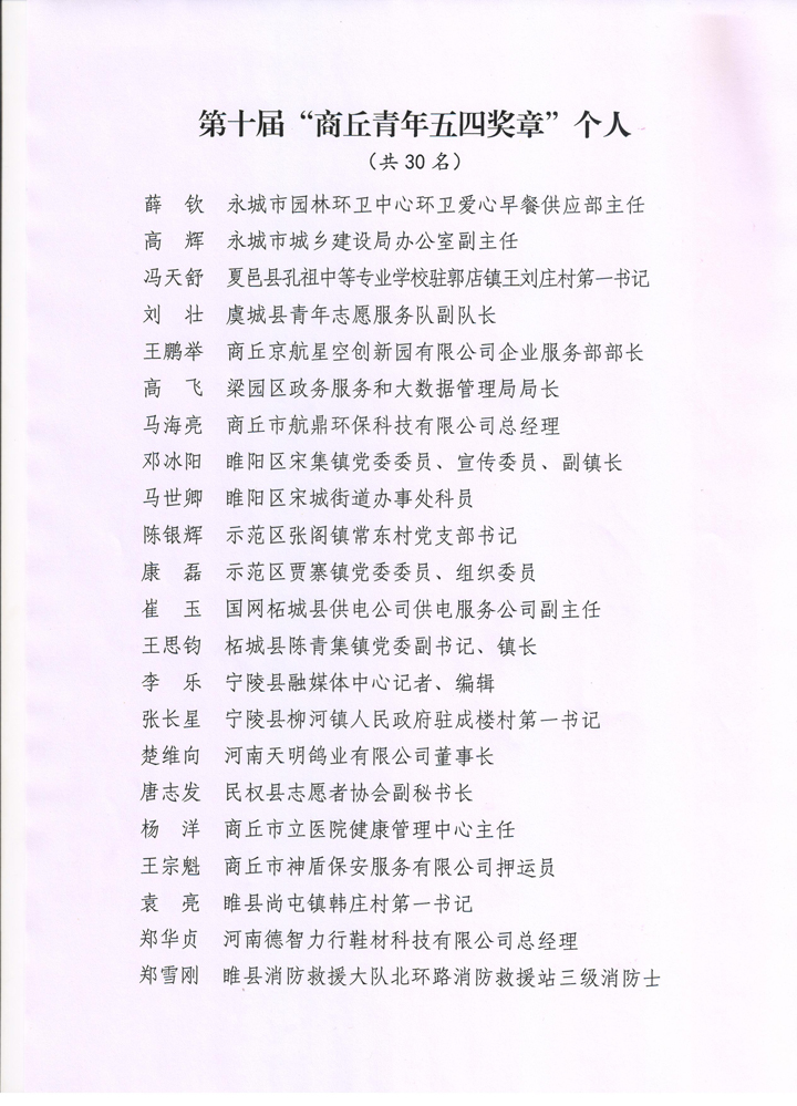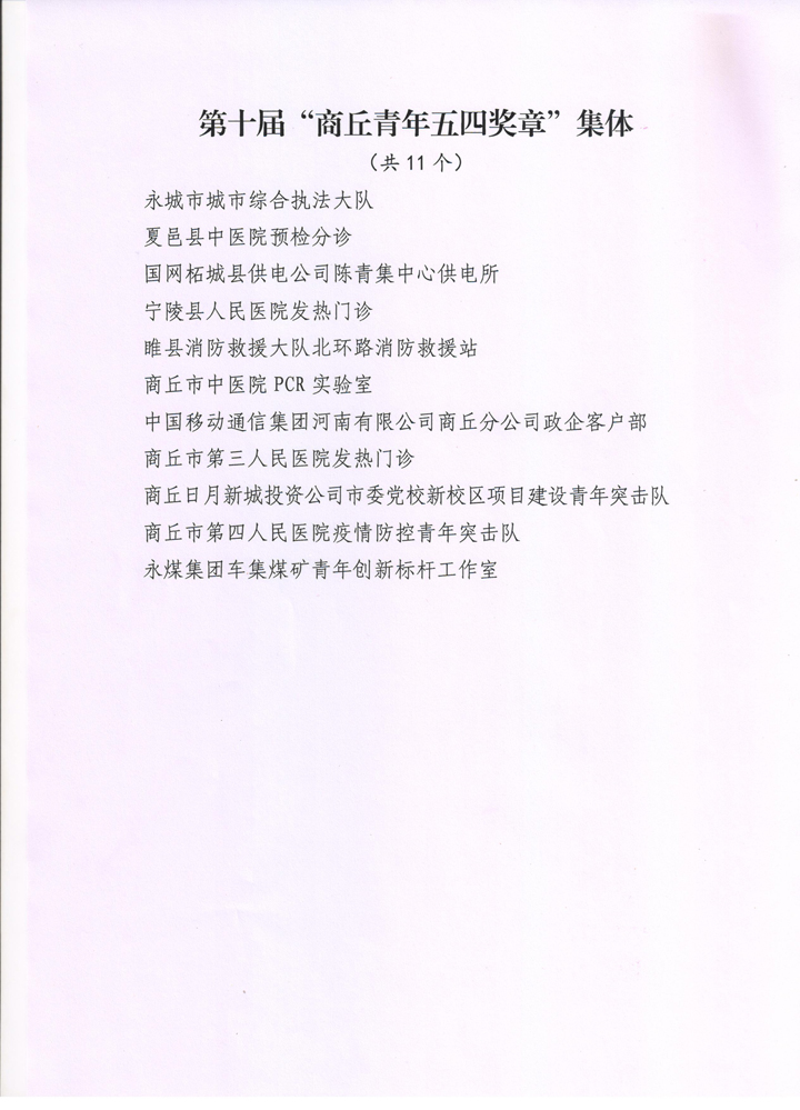 根据共青团商丘市委、商丘市青年联合会《关于申报第十届“商丘青年五四奖章”和“商丘青年五四奖章集体”的通知》(商青联字〔2022〕1号)精神,经基层单位民主推荐,坚持自下而上、逐级把关,团市委书记办公会集体研究的程序和原则,产生建议名单,现予以公示,公示期为自公示之日起5个工作日,公示期内若有异议,及时反映到团市委组织部。联系电话:0370-3288315。