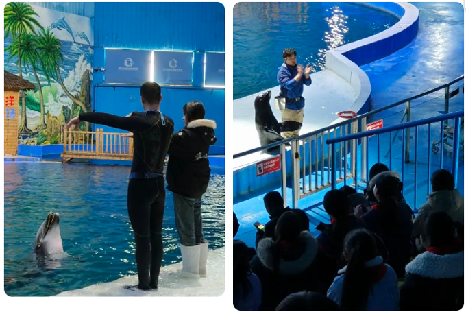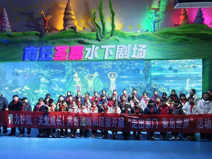 圣嘉极地海洋世界——邂逅深海奇妙,树立环保意识 告别古城,孩子们走进商丘圣嘉极地海洋世界,开启了一场沉浸式的自然奥秘探索之旅。 步入场馆,热带鱼群宛如流动的彩虹,在珊瑚丛中穿梭;企鹅挺着圆滚滚的肚子,在冰面上摇摆地行走……来自深海的神奇生物让孩子们目不暇接。在海豚海狮互动展区,主持人详细讲解了海豚和海狮的生活习性、生长环境,以及海洋生态保护的重要性。孩子们积极参加竞答比赛并与海豚互动,在与海洋精灵的“对话”中,好奇心被无限激发,同时也树立起“保护海洋生物,守护蓝色家园”的环保意识。