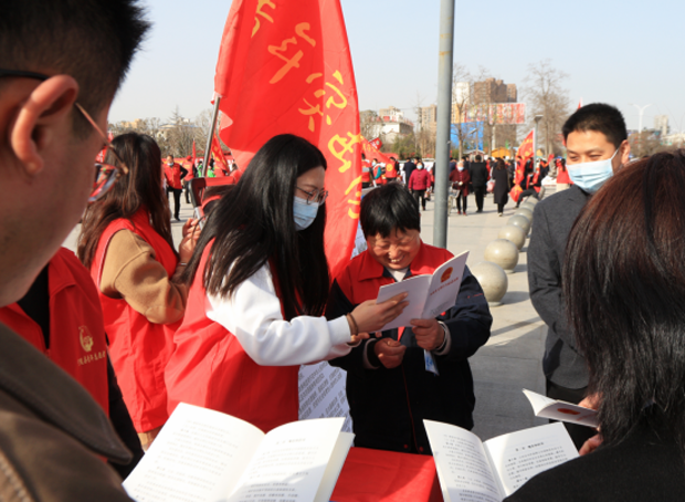 2022年3月2日下午,民权县新时代文明实践推动周启动仪式在县东区民生广场举行,团民权县委组织志愿者参加。活动现场,县团委志愿者向市民群众发放《中华人民共和国未成年保护法》《安全防范与自救》等宣传材料,并向他们讲解相关内容,教育引导市民群众养成文明习惯、树立文明风尚。