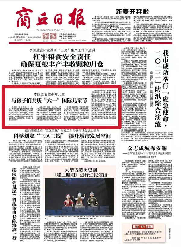 6月1日,市委书记李国胜来到市第一实验小学,参加少先队主题活动,与孩子们共庆“六一”国际儿童节,代表市委、市政府向全市少年儿童致以节日的问候,向辛勤工作的老师们表示崇高的敬意。市领导罗军、王金启、岳爱云参加活动。 走进市第一实验小学大门,一群少先队员热情地为李国胜等领导佩戴上鲜艳的红领巾。李国胜一行参观了学校“立德树人”“心理健康”“家庭教育”“双减管理”等办学特色图片展和学生书画展,对市第一实验小学突出素质教育的办学特色给予肯定,对孩子们创作的作品给予高度评价。在该校红星学院,李国胜等观看了少先队员入队仪式,并为新建中队授旗。随后,李国胜一行来到德育室,参加少先队员红色大讲堂“喜迎二十大,永远跟党走”宣讲活动。少先队员们铿锵有力的演讲《少年中国说》和童声合唱《共产主义儿童团团歌》,感染了现场每一个人。李国胜等向少年儿童代表赠送了节日慰问品,与大家合影留念。李国胜说,少年儿童是祖国的花朵,承载着国家和民族的未来。希望广大少年儿童树立共产主义远大理想,爱祖国、爱人民、爱劳动,勤奋学习、快乐生活、健康成长,早日成为对国家和社会有用的栋梁之才。广大教育工作者要把爱倾注在孩子们身上,做他们成长的引路人、权益的守护人、未来的筑梦人,为少年儿童的全面发展、茁壮成长撑起一片蓝天、厚植一方沃土。各级党委政府和相关部门要始终站在党和国家事业薪火相传的高度,重视支持少年儿童工作,共同为少年儿童成长成才提供良好的环境条件。 -------------------------------------------------------------------------------------------------------------- |