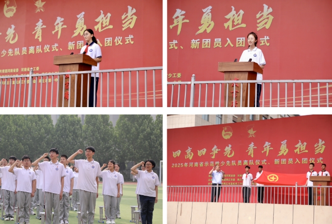5月15日上午,“四高四争先 青年勇担当”2025年河南省示范性少先队员离队仪式、新团员入团仪式在商丘市举行。团省委、商丘市政府有关负责同志出席活动并讲话,团省委相关部门、团商丘市委、市直机关工委、商丘市教体局等单位负责同志以及商丘市第一中学少先队员、共青团员代表2800余人参加活动。 仪式在庄严的国歌声中拉开帷幕。仪式上,少先队员高声齐唱《中国少年先锋队队歌》,离队少先队员最后一次郑重地向队旗敬礼,2100余名年满14周岁的少先队员光荣离队,正式迈入热情洋溢、朝气蓬勃的青年行列。与会领导为新团员代表佩戴团徽、颁发团章和团员证,全校300名同学庄严宣誓,光荣加入中国共产主义青年团。红领巾巡讲团成员带来宣讲《沐浴伟大时代 矢志挺膺担当》,用“讲理论+说故事”的形式,带领大家学习领会习近平总书记给新疆谢依特小学戍边支教西部计划志愿者服务队全体队员回信精神,将党的关心关爱讲给青少年听。随着党旗、团旗、队旗三面旗帜依次传递,仪式活动走向高潮,入队、入团、入党“人生三部曲”的政治追求在每一名青少年心中激荡。仪式结束后,与会领导与学生共同穿越“青春门”,开启逐梦人生。